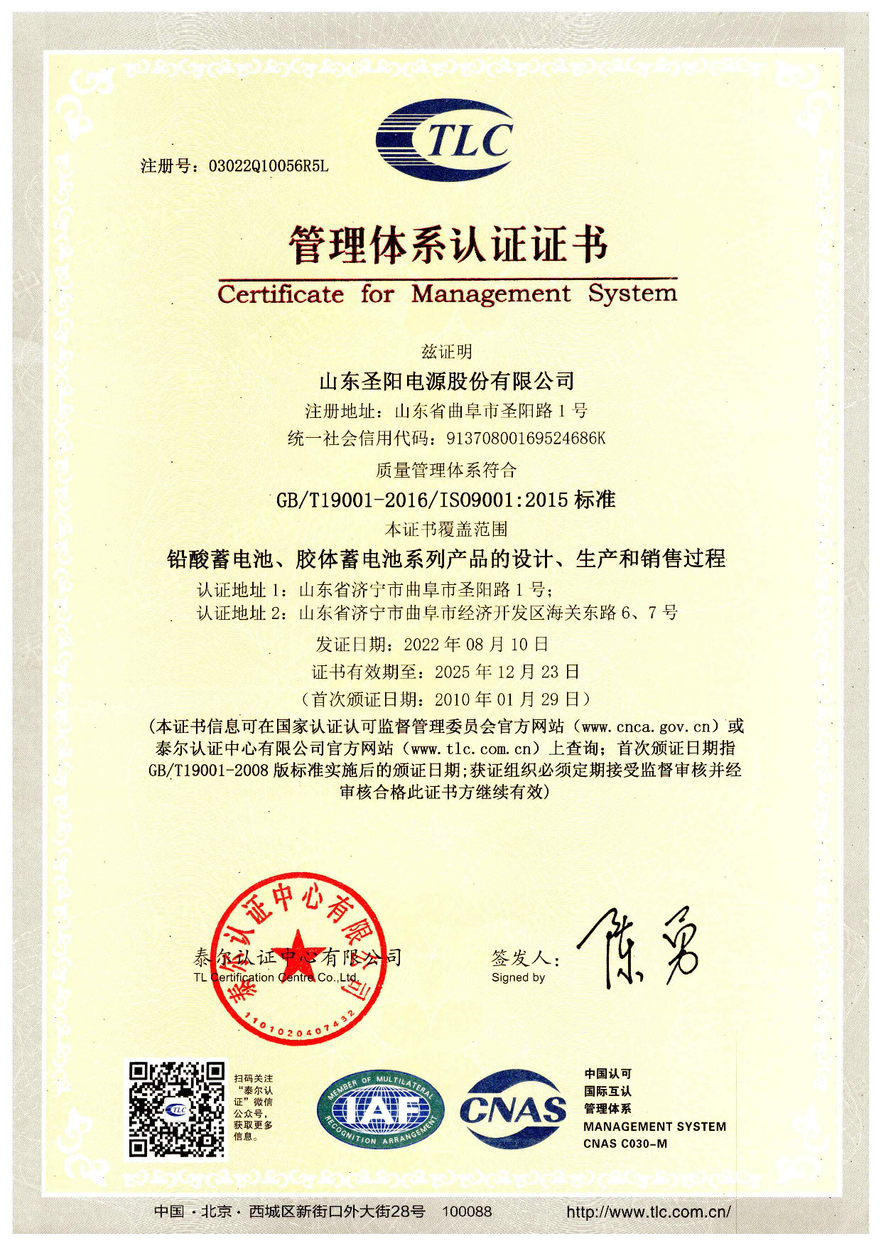 环境管理体系认证证书